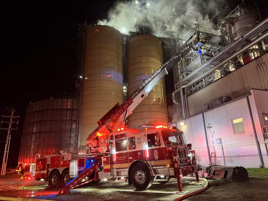 11/9/2025 at 04:27 Tower 75 was dispatched to assist Bainbridge Fire Company 71 on a fire at Perdue AgriBusiness on River Rd. in Conoy Twp. Fire was found in a piece of equipment on the roof of the facility. The tower crew assisted with opening up to access the fire as well as overhaul. A handline was also deployed off the tower to help extinguish the fire.
